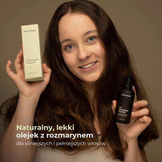Olejek do włosów z rozmarynem marki Mybiochoice stymuluje wzrost włosów i zapobiega ich wypadaniu poprzez poprawę krążenia krwi w skórze głowy i wzmocnienie mieszków włosowych.